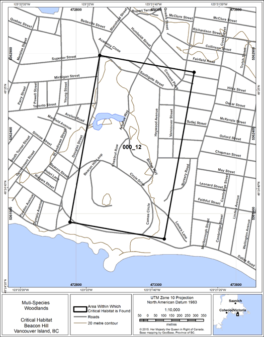 This document includes a partial identification of critical habitat for multiple species at risk in woodlands associated with Garry Oak ecosystems in British Columbia, Canada. The Government of Canada, in cooperation with the provinces and other partners, is continuing work that will lead to the identification of additional critical habitat in future recovery planning documents, in an effort to meet the population and distribution objectives for the recovery of multiple species at risk in woodlands associated with Garry Oak ecosystems in Canada.