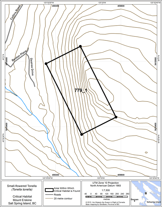 As of December 2012, approximately 1.0 ha of critical habitat has been identified for Small-flowered Tonella.
