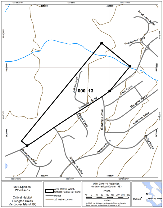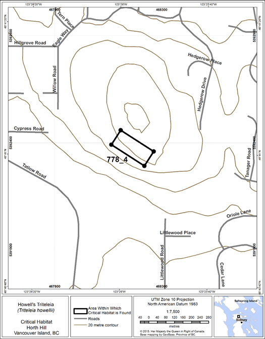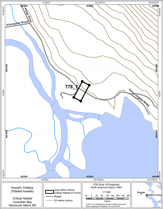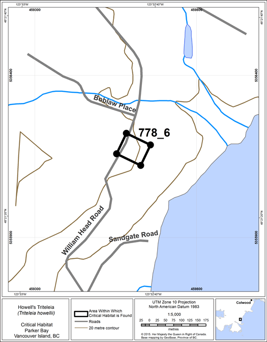 Within the geographical boundaries identified in Figure 9 (Beacon Hill), Figure 14 (Witty’s Lagoon, western sub-population), Figure 16 (Elkington Creek), Figure 17 (Horth Hill), Figure 18 (Somenos Creek), Figure 19 (Gordon Head), Figure 20 (Parker Bay), and Figure 21 (Cowichan River Estuary) critical habitat is identified as all areas within 20 metres of the recorded location of each patch of Howell’s Triteleia (Costanzo et al. 2009a; GOERT 2009; GOERT 2012; Fleming 2010). The following populations were partially surveyed: Beacon Hill, Horth Hill, Elkington Creek (eastern sub-populations) (Costanzo et al. 2009a), Elkington Creek (western sub-population), and Cowichan River Estuary (northern sub-population) (GOERT 2009), Somenos Creek (Fleming 2010), Gordon Head, Parker Bay (southern subpopulation) and Witty’s Lagoon (western sub-population) (GOERT 2012). These partial surveys confirmed the continued existence of the species and its habitat at the sites and provided partial information on habitat and location. Data from the BC Conservation Data Center (2012) is accepted as the best available information for the location of the northern sub-population at Parker Bay and the populations at Cowichan River Estuary.