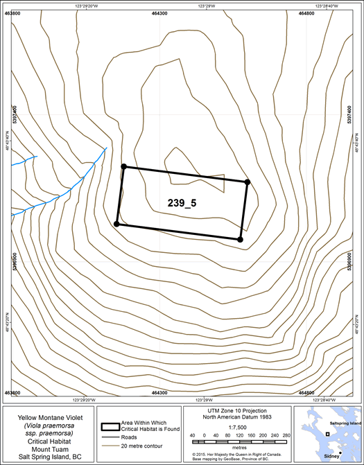 Within the geographical boundaries identified in Figure 6 (Mt Tzuhalem) and Figure 23 (Bear Hill), critical habitat is the area around each patch of Yellow Montane Violet praemorsa subspecies where the canopy structure directly influences the amount of light reaching the plants. This area varies in size based on the height of vegetation able grow nearby (up to a maximum of 20 metres) and was mapped by Fairbarns (2008a and 2008b).