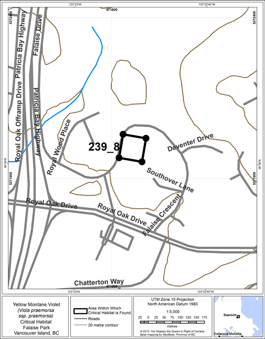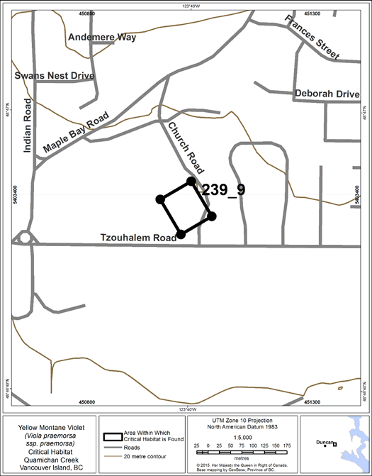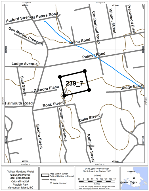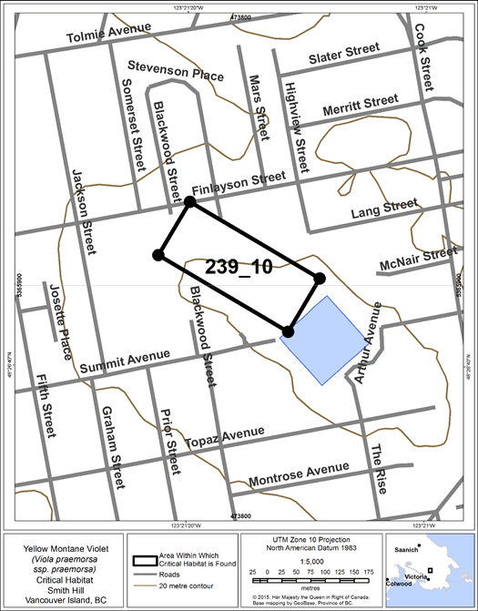 Within the geographical boundaries identified in Figure 9 (Beacon Hill), Figure 16 (Elkington Creek), Figure 18 (Somenos Creek), Figure 22 (Little Saanich Mountain), Figure 24 (Uplands Park/Cattle Point), Figure 25 (Mt. Maxwell), Figure 26 (Mt. Tuam), Figure 27 (Christmas Hill), Figure 28 (Playfair Park), Figure 29 (Falaise Park), Figure 30 (Quamichan Creek), Figure 31 (Smith Hill), and Figure 32 (Parry Bay), critical habitat is identified as all areas within 20 m of the recorded location of each patch of Yellow Montane Violet praemorsasubspecies (Roemer and Annschild 2008; Costanzo et al.2009b; GOERT 2008, 2009 and 2012; Maslovat 2009; Fleming 2010). The following populations were partially surveyed: Beacon Hill, Uplands/Cattle Point, Christmas Hill, Smith Hill (Costanzo et al. 2009b), Somenos Creek (Fleming 2010), Mount Tuam (Roemer and Annschild 2008), Mount Maxwell (Maslovat 2009), Quamichan Creek (GOERT 2008), Little Saanich Mountain, Falaise Park (GOERT 2009), Playfair Park and Parry Bay (GOERT 2012). These partial surveys confirmed the continued existence of the species and its habitat at the sites and provided partial information on habitat and location.
