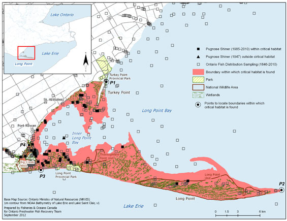 7 Pugnose Shiner were detected in four new locations after the recovery potential assessment was completed. Discussions with local conservation authorities, OMNR, Provincial Park staff, National Wildlife Area staff, and DFO staff, using the same criteria as Bouvier et al. (2010), determined threat status for these locations.
