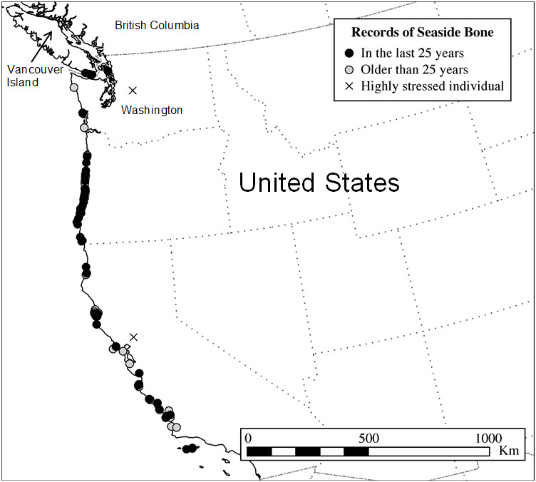 Seaside Bone Lichen is endemic to the coast of western North America. Most populations occur between Santa Barbara County California in the south to Tillamook County Oregon in the north. A few populations are found farther north, ranging northwards into coastal Washington and southern British Columbia. The locations of all known records of Seaside Bone Lichen are shown in Figure 1.