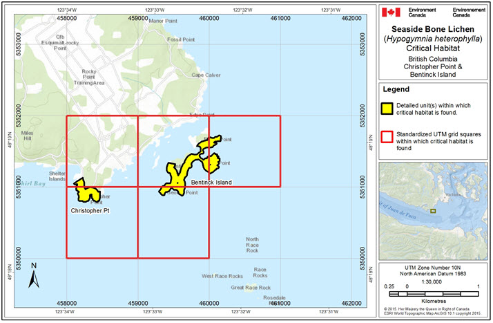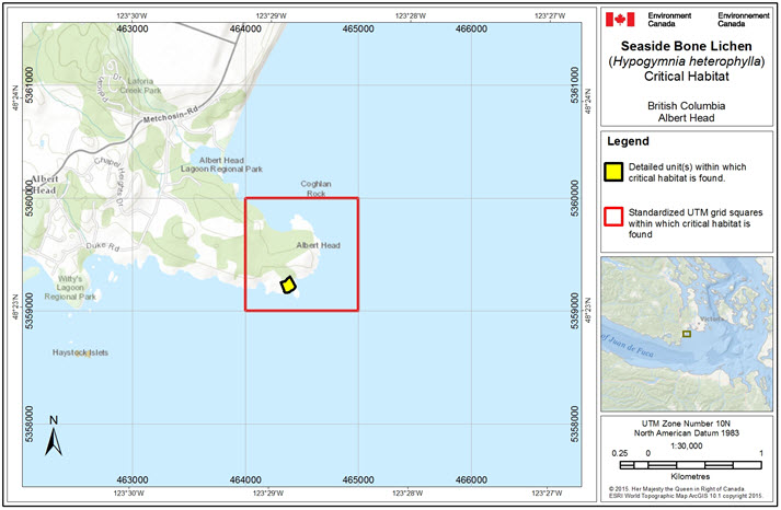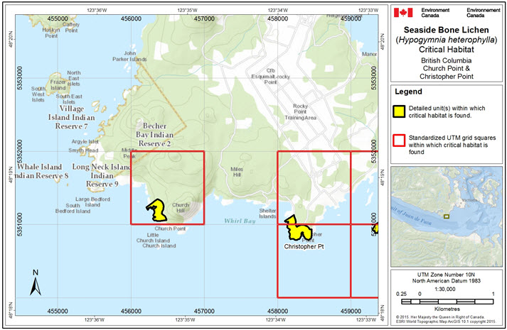 In total, 85.32 ha of area containing critical habitat for Seaside Bone Lichen is presented in Figures 3-8. Critical habitat for Seaside Bone Lichen in Canada occurs within the shaded yellow polygon(s) (unit(s)) shown on each map where the critical habitat criteria (i.e., biophysical attributes, as described above) are met. The 1 km x 1 km UTM grid overlay shown on these figures is a standardized national grid system that highlights the general geographic area containing critical habitat, for land use planning and/or environmental assessment purposes. A detailed critical habitat identification methodology is archived in a supporting document.