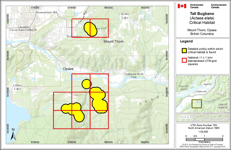 Figure 5 shows the 10 1x1 km grid squares where critical habitat for the Tall Bugbane is found in Mount Thom and Opsee in British Columbia. The grid squares are found in the South of British Columbia in the Fraser Valley region. There are four areas of concentration. Three of them are concentrated in eight grid squares in the Opsee area found in the south of the Chiliwack River. The Mount Thom area is located north of the Chiliwack River and is spread into two grid squares.