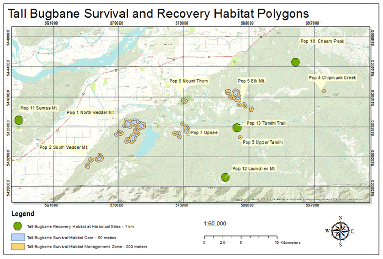 Figure 7 shows a detailed, high resolution (1:12000) satellite image of the North Vedder Mountain in British Columbia, and overlap of mapped survival and recovery habitat for Tall Bugbane, including core areas at fifty meters from individual plants, and an additional two hundred (200) meter habitat management zone extending from the edge of core survival and recovery habitat. Combined core and extended habitat management zones overlap primarily in the north-central portion of North Vedder Mountain, with two disjunct areas in the western portion of the mountain range.