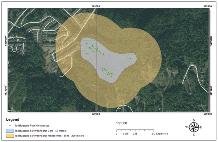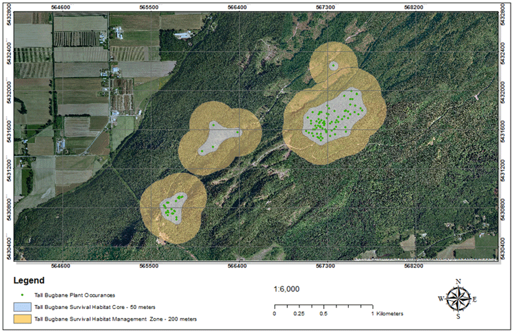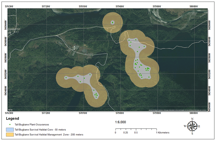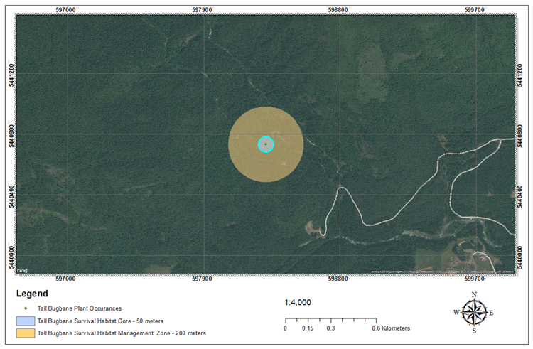 Figure 9 shows a detailed, very high resolution (1:4000) satellite image of Upper Tamihi in British Columbia, and overlap of survival and recovery habitat for a single occurrence of Tall Bugbane, including a core area (light shaded blue) of fifty meters from the individual, and an additional two hundred (200) meter habitat management zone extending from the edge of core survival and recovery habitat.