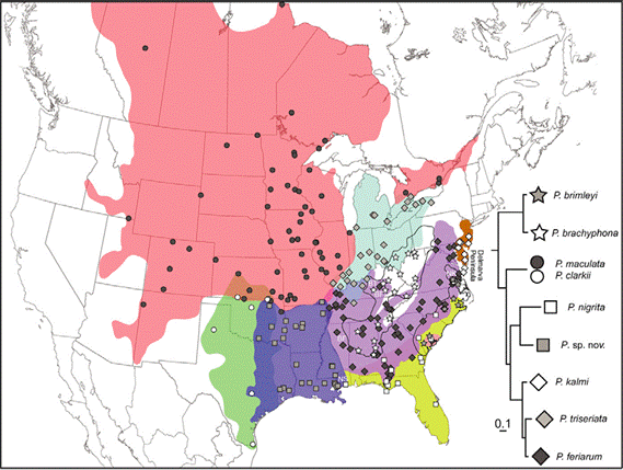 Map showing the distribution of genetic lineages of a group of closely related chorus frog species in North America as determined by Lemmon et al. (2007) from mitochondrial DNA sequences. The genetic lineage found to be associated with Western Chorus Frogs (Pseudacris triseriata) is shown as grey diamonds against a blue-green background that includes southwestern Ontario. The lineage associated with Boreal Chorus Frogs (P. maculata) is shown as black dots against the pink background, which is predominantly in the west. Note the presence of the Boreal Chorus Frog-type lineage in a disjunct region in southeastern Ontario and southwestern Québec (shown in pink), an area where Western Chorus Frog had previously been considered to occur. Source: Lemmon et al. (2007).
