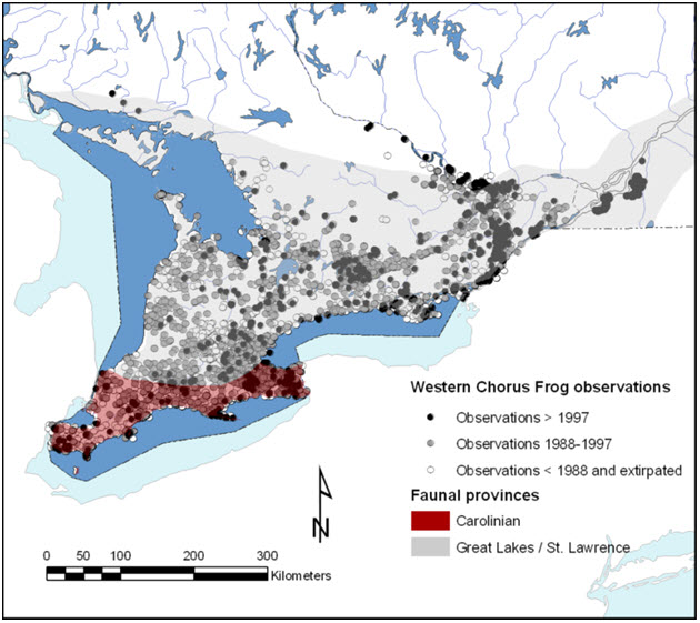 - Figure 1. Western Chorus Frog faunal provinces and observations of the species in the Carolinian and the Great Lakes / St. Lawrence faunal provinces (adapted from COSEWIC 2008). Observations above the grey shared area fall in the Canadian Shield faunal province.