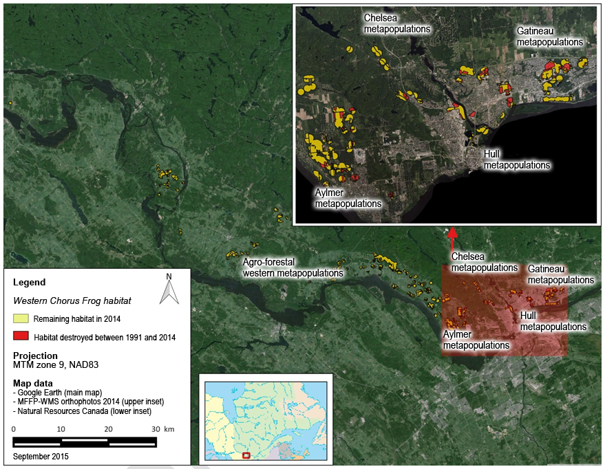 Map showing areas of remaining and destroyed suitable habitat for Western Chorus Frog between 1991 and 2014 in five metapopulations of Outaouais. These are, from east to west, the Gatineau metapopulation, the Hull metapopulation, the Chelsea metapopulation, the Aylmer metapopulation, and the Agro-forestal western metapopulation.