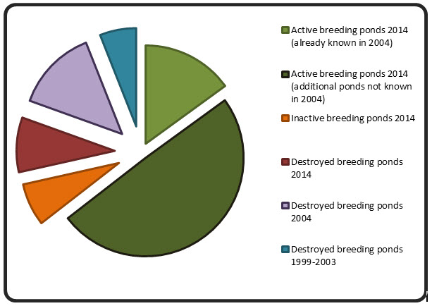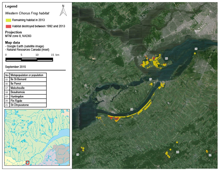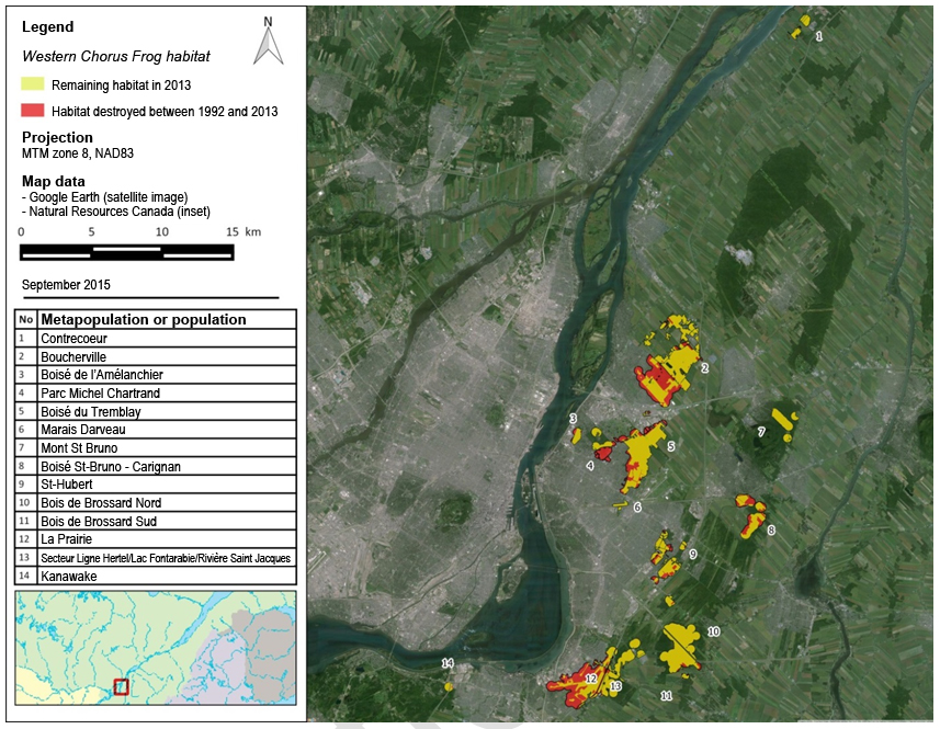 Since 2010, additional Western Chorus Frog breeding sites were destroyed as can be seen in raw survey data of the long-term monitoring surveys done by the Ministère des Forêts, de la Faune et des Parcs.