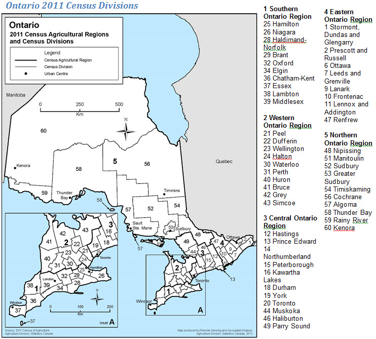 - Figure A. 2011 Ontario census divisions (Statistics Canada 2012). A total of 49 census divisions occur in Ontario, 39 of which contain observations of the Western Chorus Frog (GLSLCS).