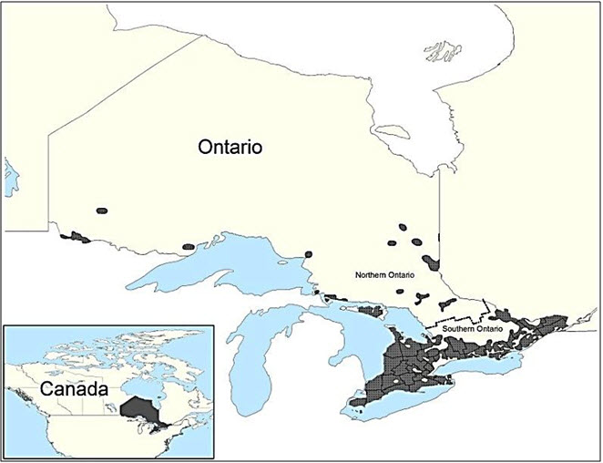 In Ontario, the Western Chorus Frog is more widespread with a range that extends from the United States border (in the east) and Carolinian- Great Lakes/ St. Lawrence faunal province boundary (in the west) northward into the southern part of the Canadian Shield faunal province. It extends eastward from the Sault Ste. Marie area to the Ottawa Valley and along the St. Lawrence River into the province of Quebec. It should be noted that a small number of records of Western Chorus Frog fall within the districts of Cochrane and Timiskaming. These records were retained for this assessment because a northern boundary for the DU was not defined by COSEWIC, and the records occur east of the range of the Boreal Chorus Frog.