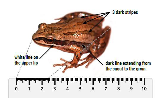 Diagram showing a Western Chorus Frog with its principal characteristics used for identification. Information pop-ups point to the different characteristics: the three dark stripes on its back, the pale stripe along the upper lip, and the dark stripe running from the snout to the groin. A ruler completes the diagram showing the length of 2.5 cm.