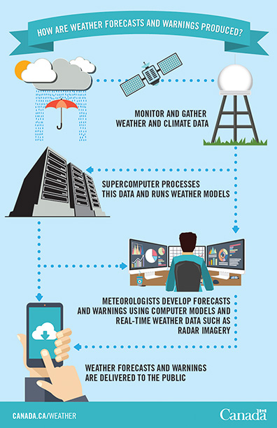 Infographic showing how weather forecasts and warnings are produced.
