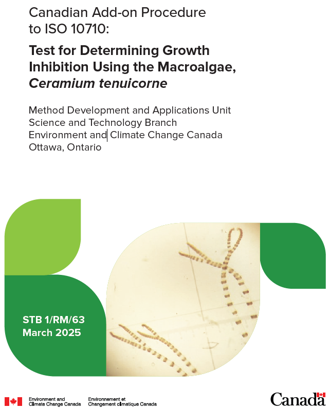 In order to restore the previous flexibility in test species options, ECCC investigated other standardized test methods using marine macroalgae species and focused on the ISO 10710 standard method for Ceramium tenuicorne. After confirming that Ceramium tenuicorne is ecologically relevant to the Canadian marine environment (Garbary and McDonald, 1996; Sloan and Bartier, 2000; ECCC, 2020), ECCC’s Method Development and Applications Unit (MDAU) reviewed the ISO (2010) standard and developed the additional procedures and conditions necessary to ensure compatibility with other sublethal toxicity test methods specified in Canadian regulations. This add-on procedure for conducting the ISO 10710 standard method in a Canadian context was further refined through research conducted at a Canadian commercial laboratory (AquaTox, 2022, 2023; Nautilus Environmental, 2024). As stated in Section 1, this add-on procedure must be used in conjunction with the ISO 10710 standard (ISO, 2010).