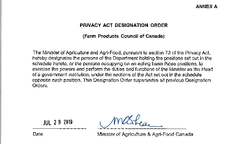 Section 73 of the Access to Information Act provides for the Minister, as head of Agriculture & Agri-Food Canada, to delegate the powers, duties and functions designated by the Act.