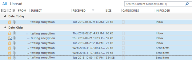 - From your Encrypted Emails subfolder, select the field above the emails that says search Encrypted Email (Ctrl + E), and enter your search term. Ensure that the Current Folder option is selected in the drop-down menu to the right of the field. Relevant results will then be displayed.