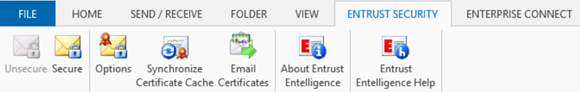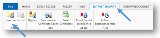 - To decrypt the emails that you have selected, select the Entrust Security tab in the Microsoft Outlook ribbon and select the Unsecure icon. The selected emails are now decrypted. Keep repeating steps 1 and 2 until all the emails in your Encrypted Emails subfolder are decrypted.