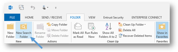 - To create a custom search folder, open Microsoft Outlook, select the Folder tab on the ribbon, and then select the New Search Folder button.