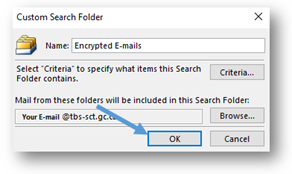 - In the New Search Folder window, select the OK button. Outlook will then create the custom search folder and add it to your Outlook folder list on the left-hand side of the screen. You should be able to see your new Encrypted Emails search folder under the Search Folders heading. The search that you have set up, by following the preceding steps, will be conducted automatically when you select the Encrypted Emails search folder.