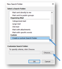 - In the New Search Folder window, scroll down to the bottom of the list. Select the Create a custom Search Folder option, and then select the Choose button.