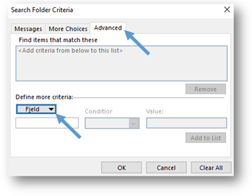 - In the Search Folder Criteria window, select the Advanced tab. This tab lets you add criteria based on all the fields that an Outlook email can store.