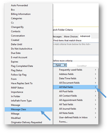 - Select the Field button below Define more criteria and a drop-down menu will appear. From the drop-down menu, select All Mail fields and then Message Class.