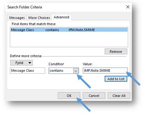- Under Condition, make sure that the drop-down menu says contains. Under Value, enter IPM.Note.SMIME in the empty field and click on the Add to List button.