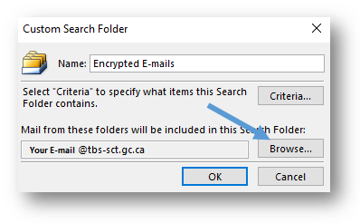 - By default, the custom search that you create will search your entire Outlook mailbox. If you want to conduct a search in specific mailbox, select the Browse button.