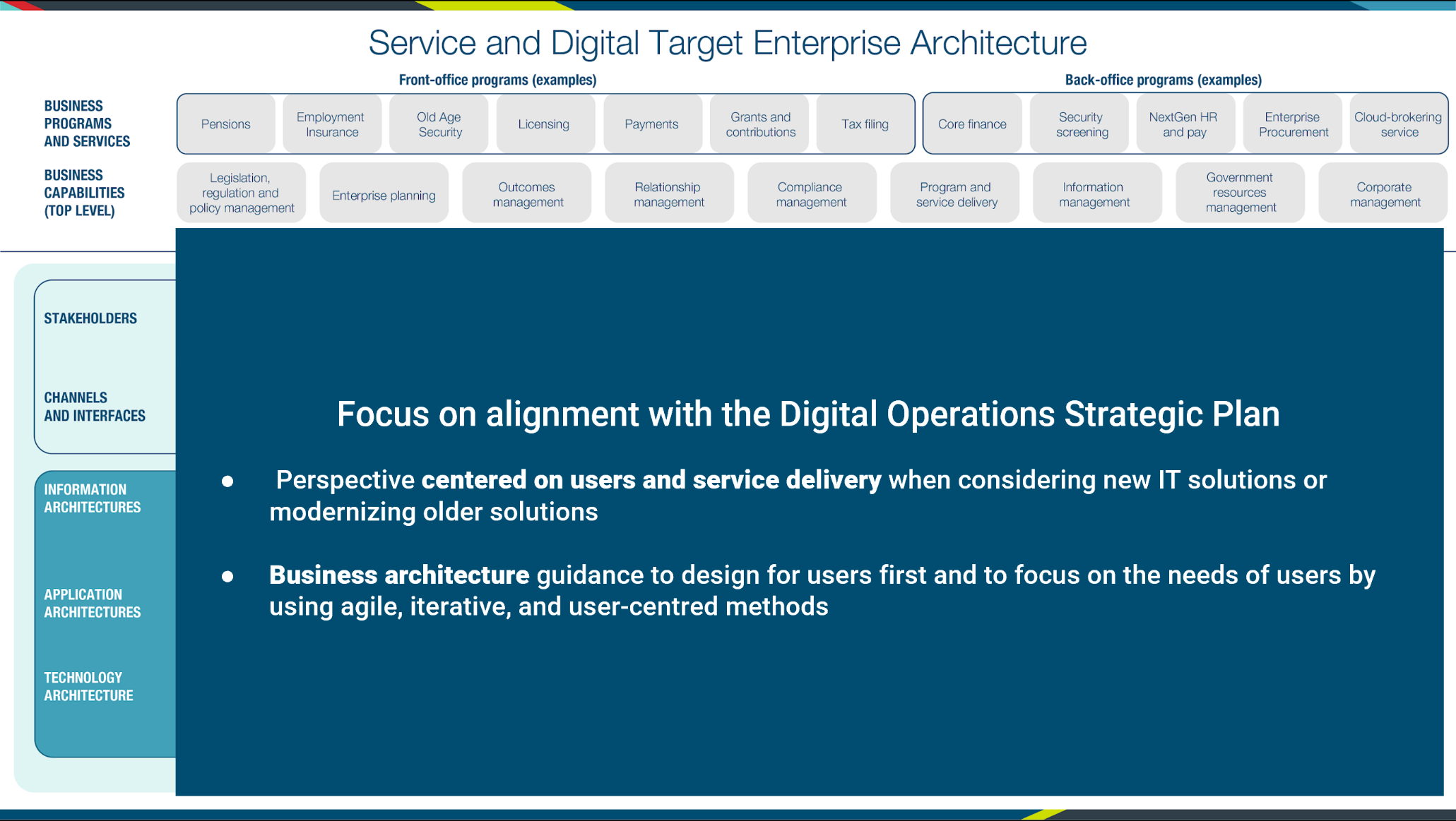 The next layer projects the idea of a service‑oriented government, with a user‑centred approach to the business of government that puts citizens and their needs as the primary focus of our work, using “tell‑us‑once” service approaches, integrated services across the GC program and service landscape in a way that provides real‑time information to Canadians about their service applications. It is a perspective centred on users and service delivery when considering new IT solutions or modernizing older solutions. It builds on business architecture guidance to design for users first, focusing on the needs of users, using agile, iterative, and user‑centred methods in a whole-of-government context.