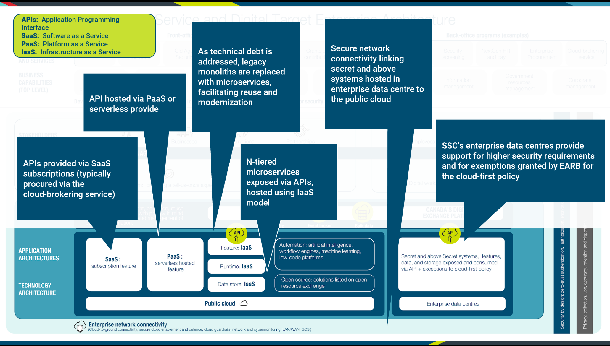 The Service and Digital Target Enterprise Architecture defines a model for the digital enablement of Government of Canada services that address many of the critical challenges with the current GC enterprise ecosystem. It seeks to reduce the silos within the current GC ecosystem by having departments adopt a user‑ and service‑delivery‑centric perspective when considering new IT solutions or modernizing older solutions. It advocates a whole‑of‑government approach where IT is aligned to business services and solutions are based on reusable components implementing business capabilities optimized to reduce unnecessary redundancy. This reuse is enabled using published APIs shared across government. This approach allows the government to focus on improving its service delivery to Canadians while addressing the challenges with legacy systems.