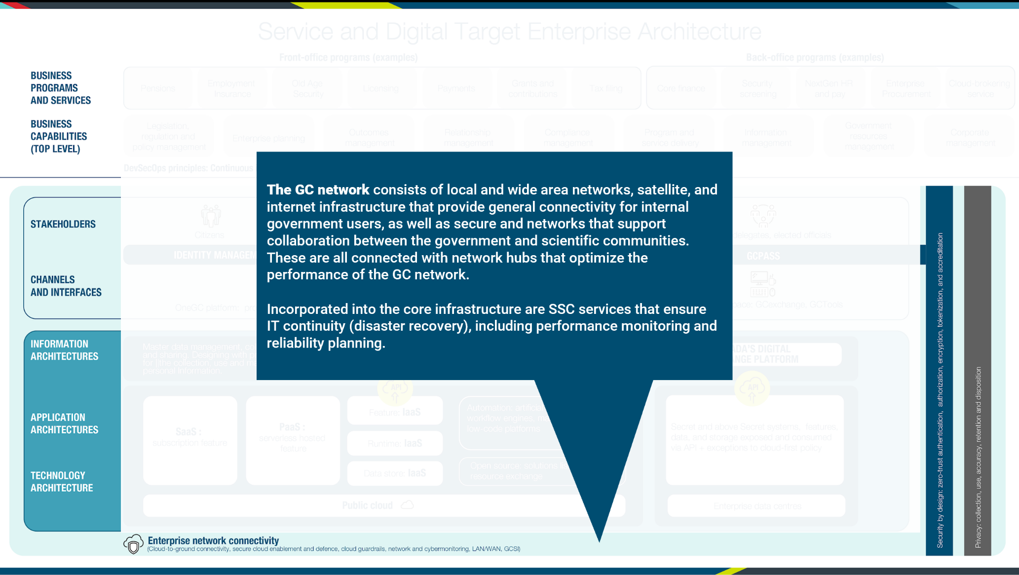 In the bottom most view of the Service and Digital Target Enterprise Architecture, the focus is on the technology infrastructure that acts as the glue to bring everything together: the network. The GC network consists of local area network (LAN), wide area network (WAN), satellite, and internet infrastructure that provides general connectivity for internal government users, as well as secure and networks that support collaboration between the government and scientific communities. These are all connected with network hubs that optimize the performance of the GC network. The core infrastructure includes SSC services that ensure IT continuity (disaster recovery), including performance monitoring and reliability planning.