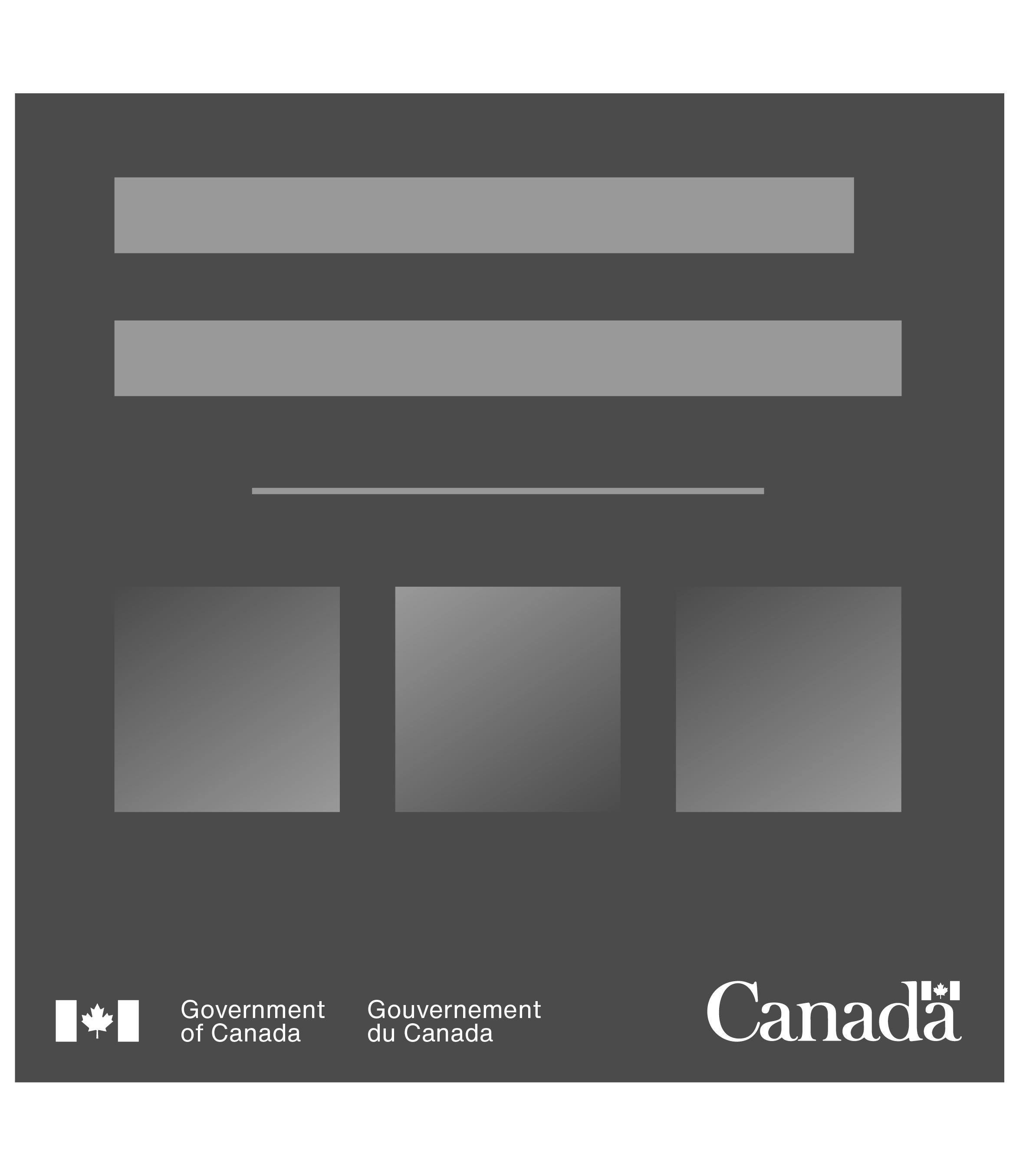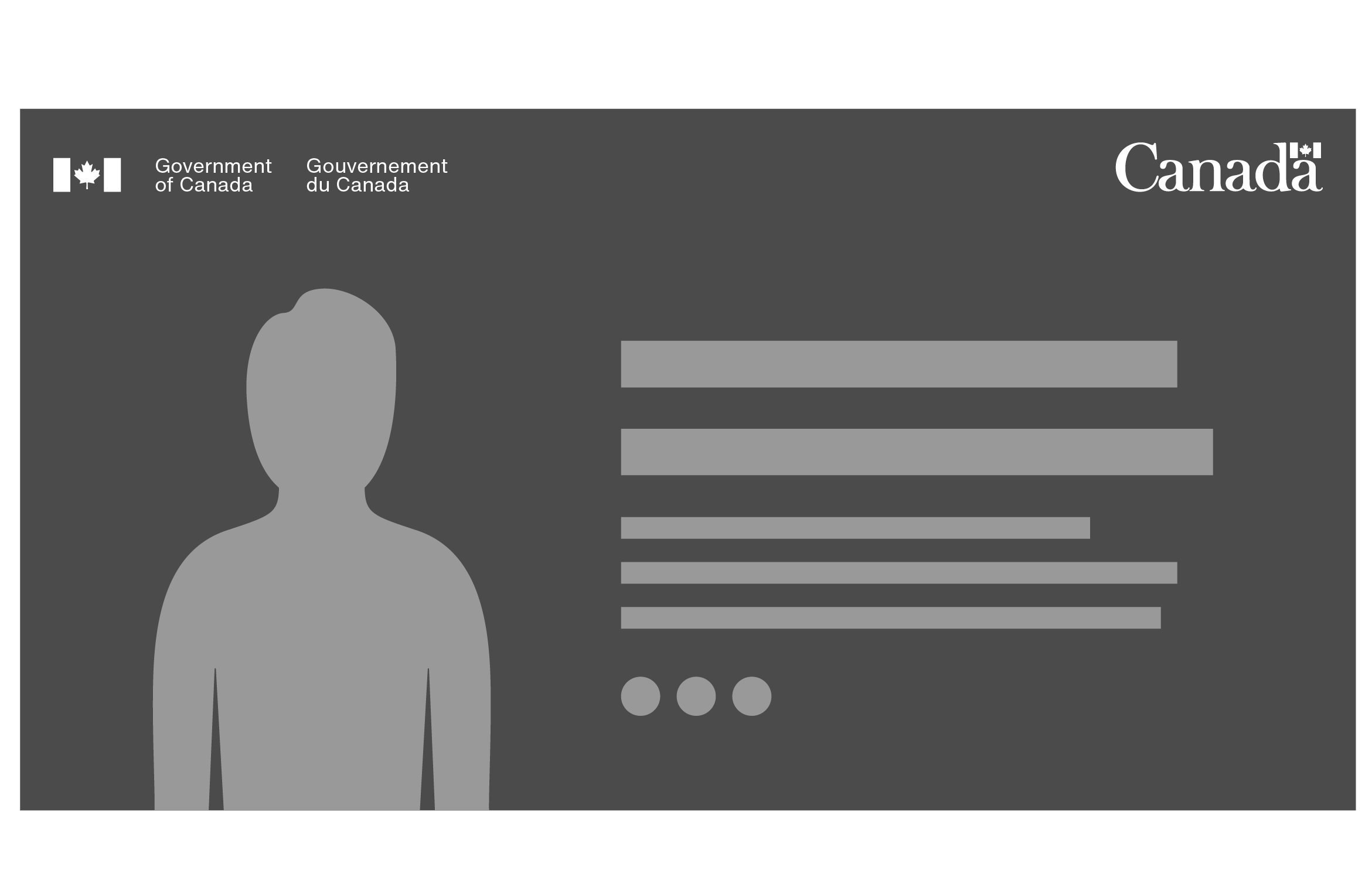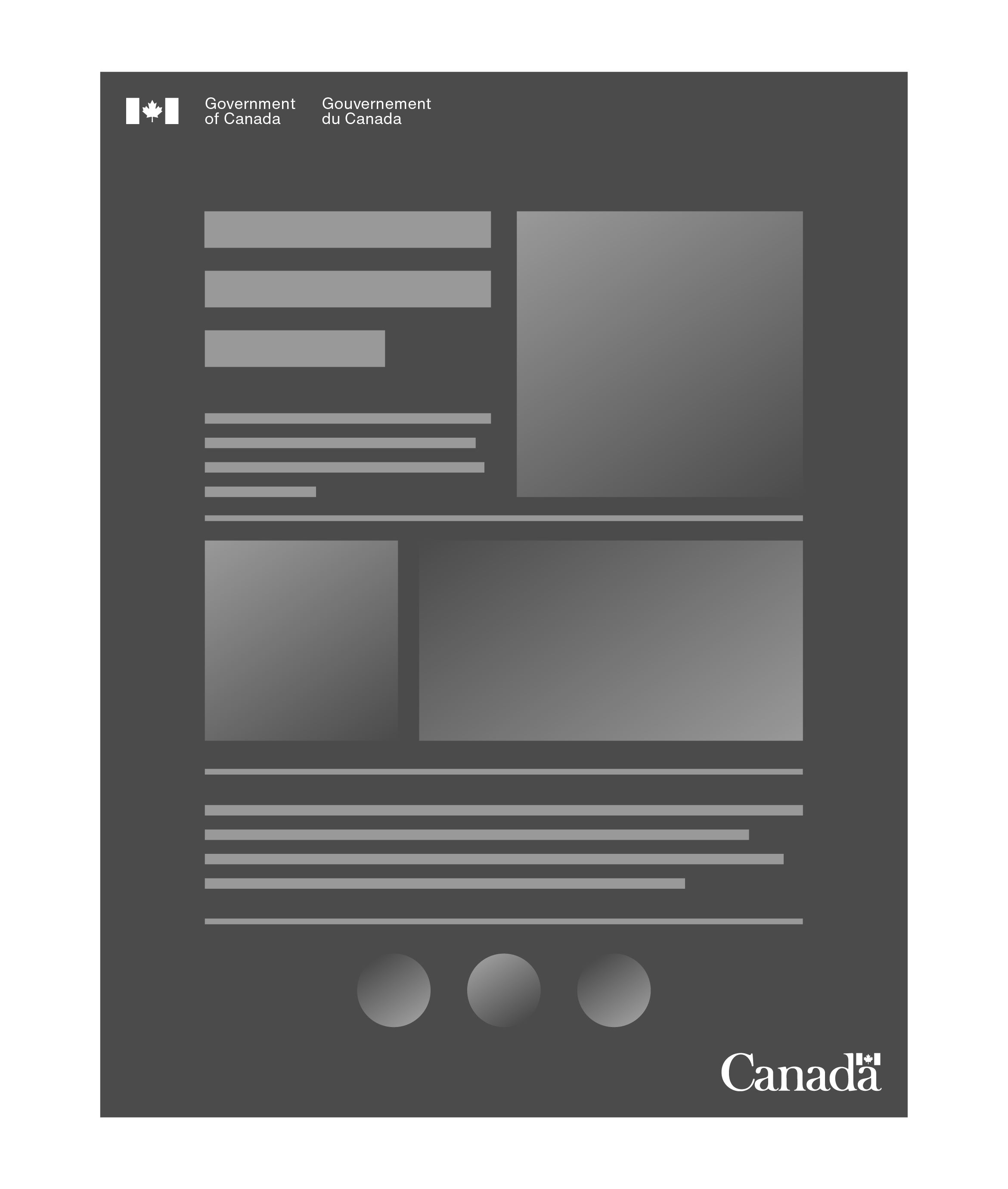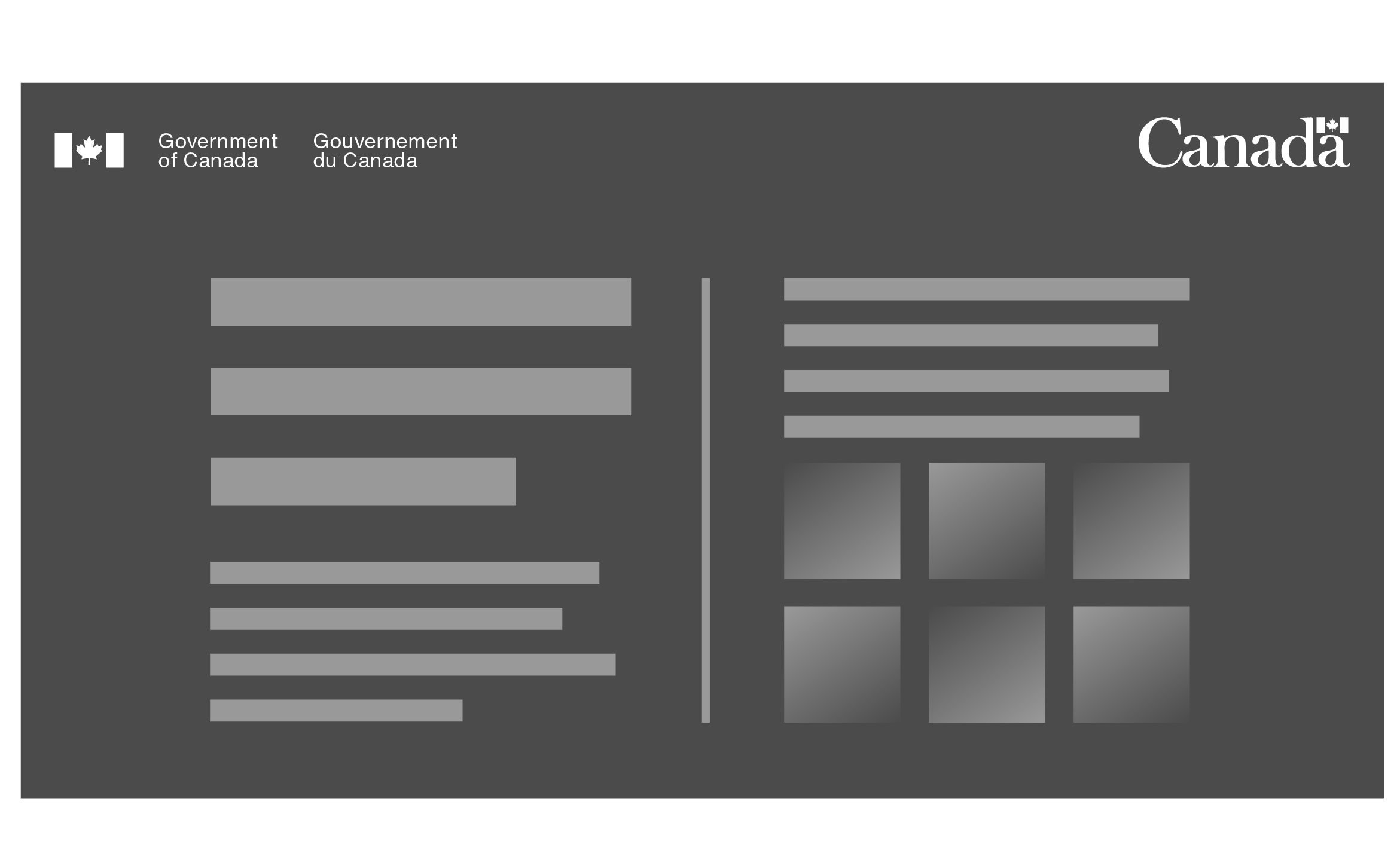 Example of an animated product. Because the product contains a government message, the Government of Canada signature and the Canada wordmark are applied. The signature and the Canada wordmark are on the same baseline at the bottom of the product. The signature is in the left corner, and the wordmark is in the right corner. Solid white versions of the symbols are used to provide sufficient contrast with the black background.