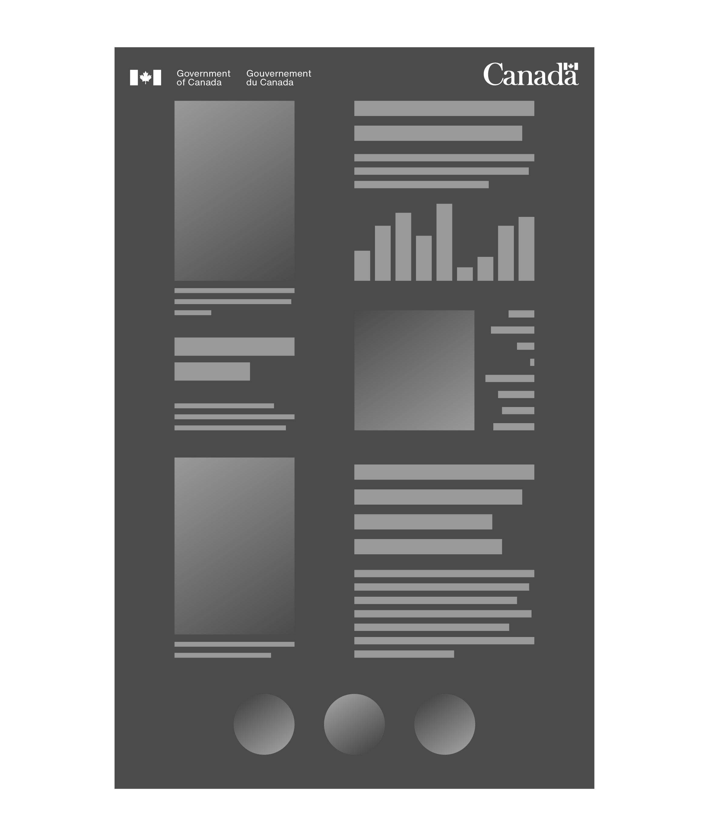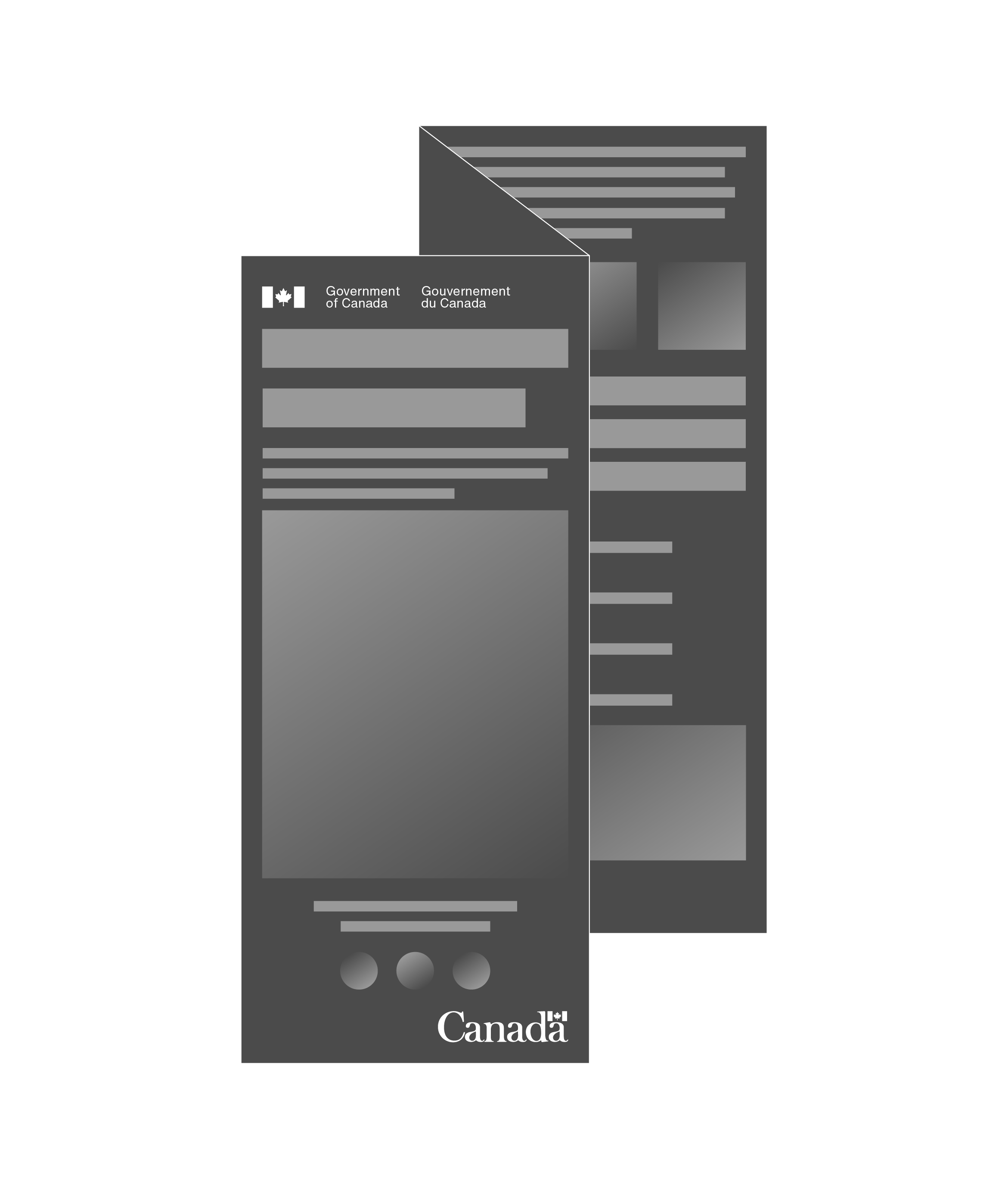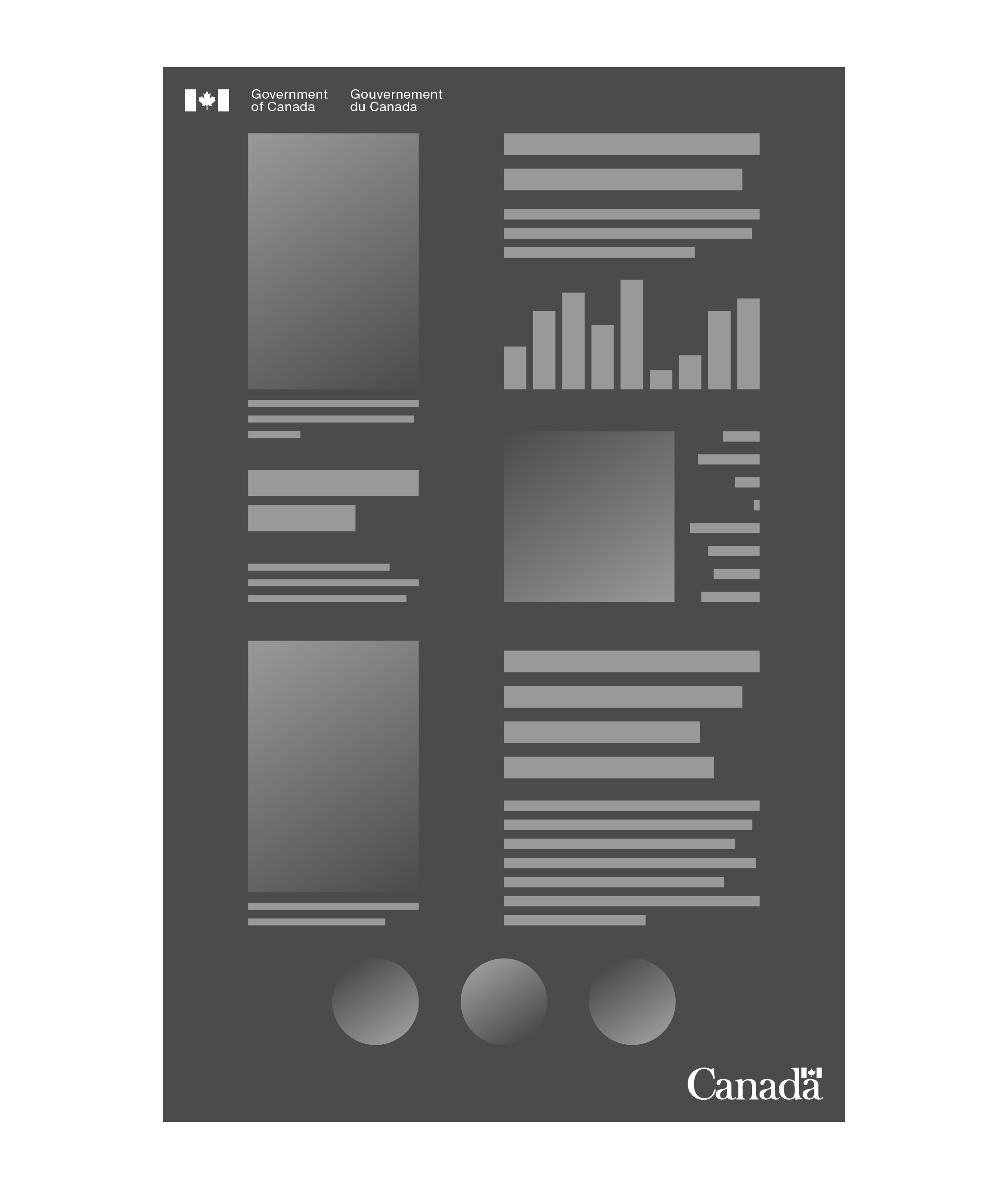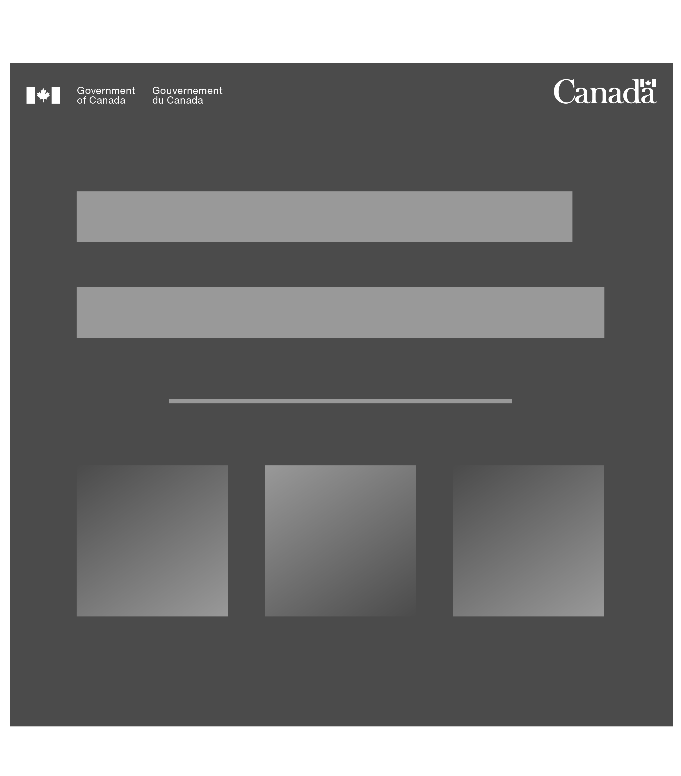 Example of an animated product. Because the product contains a government message, the Government of Canada signature and the Canada wordmark are applied. The signature and the Canada wordmark are on the same baseline at the bottom of the product. The signature is in the left corner, and the wordmark is in the right corner. Solid white versions of the symbols are used to provide sufficient contrast with the black background.
