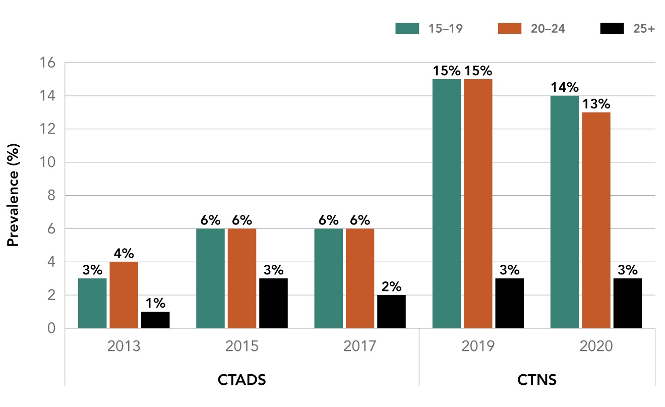 Source: Canadian Tobacco Alcohol and Drugs Survey (CTADS) 2013, 2015, 2017 / Canadian Tobacco and Nicotine Survey (CTNS) 2019, 2020.