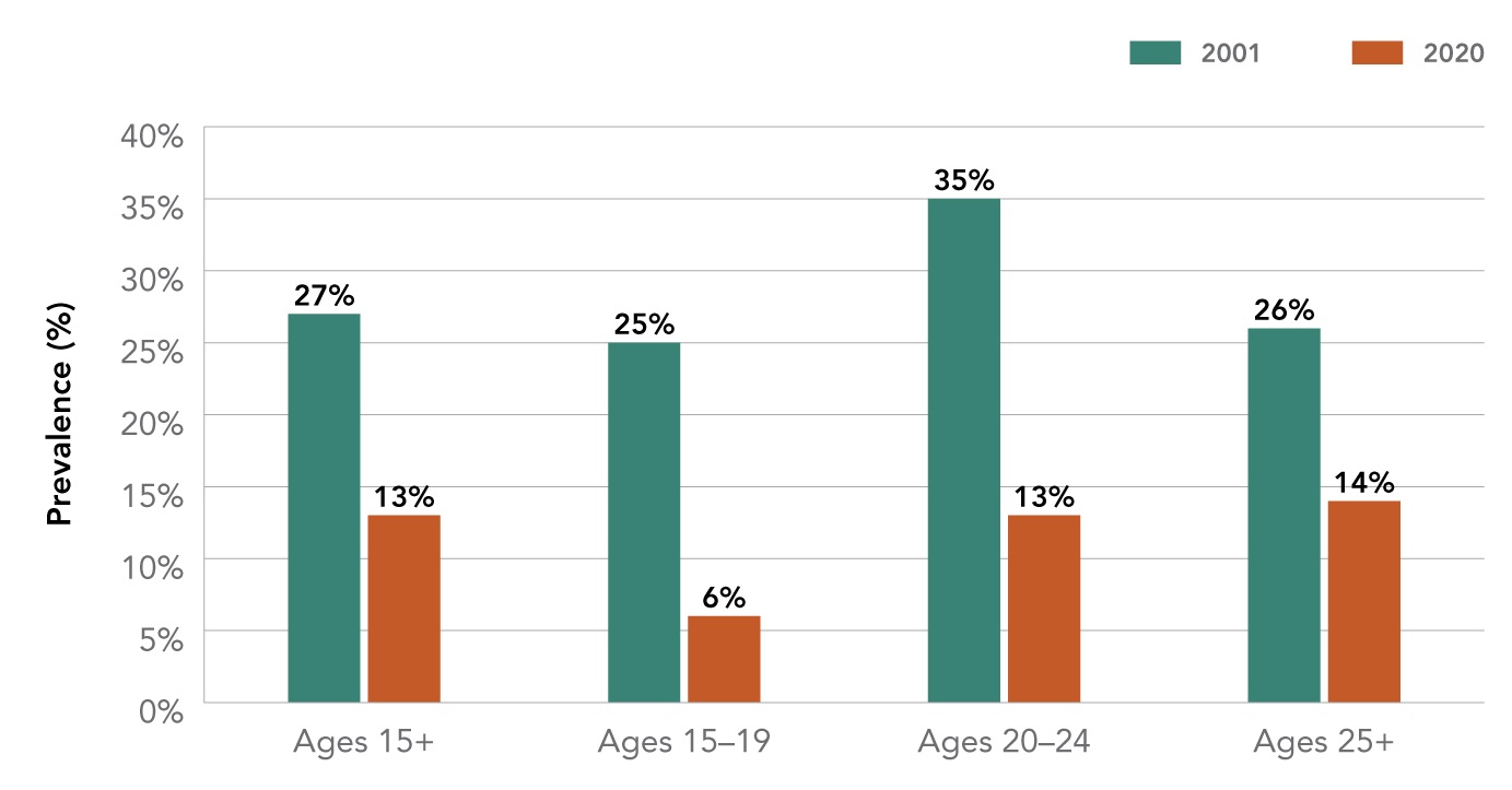 | Prevalence of past 30-day smoking in Canada by age (2001 - 2020) | ||