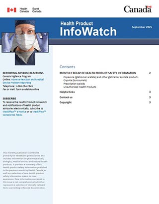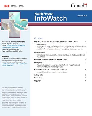 The Health Product InfoWatch is a monthly publication intended primarily for healthcare professionals. It provides clinically relevant safety information on pharmaceuticals, biologics, medical devices and natural health products.