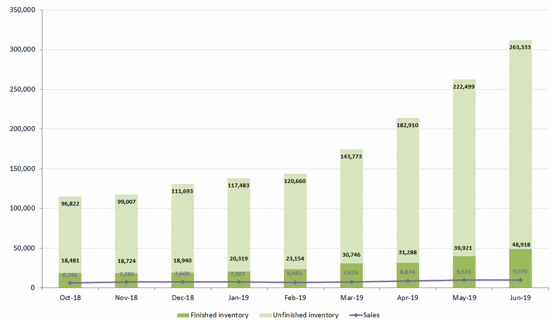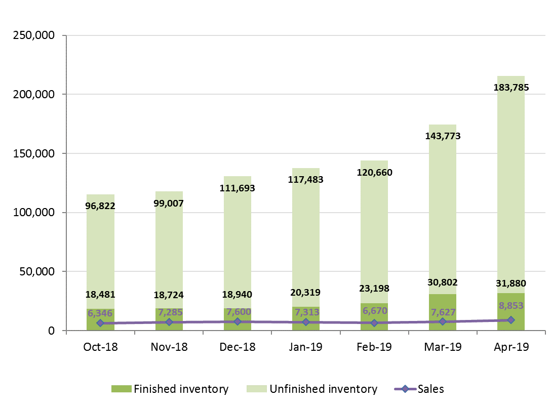| Year-month | Packaged inventory (units) | Sales (units) | ||
