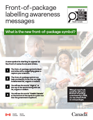 Health Canada developed the front-of-package symbol to help you quickly and easily identify foods and drinks high in saturated fat, sugars or sodium.
