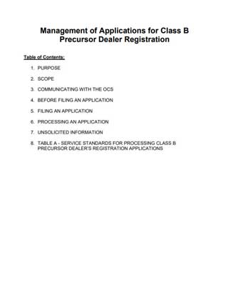 The purpose of this policy is to outline the manner in which the Office of Controlled Substances (the OCS) manages applications for Class B Precursor Dealer's Registrations submitted in accordance with the Controlled Drugs and Substances Act, and the Precursor Control Regulations.