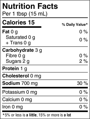 Look at the serving size on the nutrition facts table. The serving size for soy sauce is 1 tbsp (15 mL). Compare this amount to the quantity that you actually eat.
