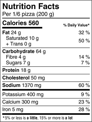 Look at the serving size on the nutrition facts table. The serving size for the pizza is 1/6 pizza (200 g). Compare this amount to the quantity that you actually eat.