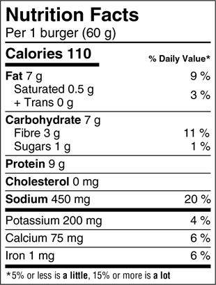 Look at the serving size on the nutrition facts table. The serving size for this veggie burger is 1 burger (60 g). Compare this amount to the quantity that you actually eat.
