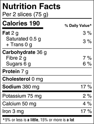 Look at the serving size on the nutrition facts table. The serving size for white bread is 2 slices (75 g). Compare this amount to the quantity that you actually eat.