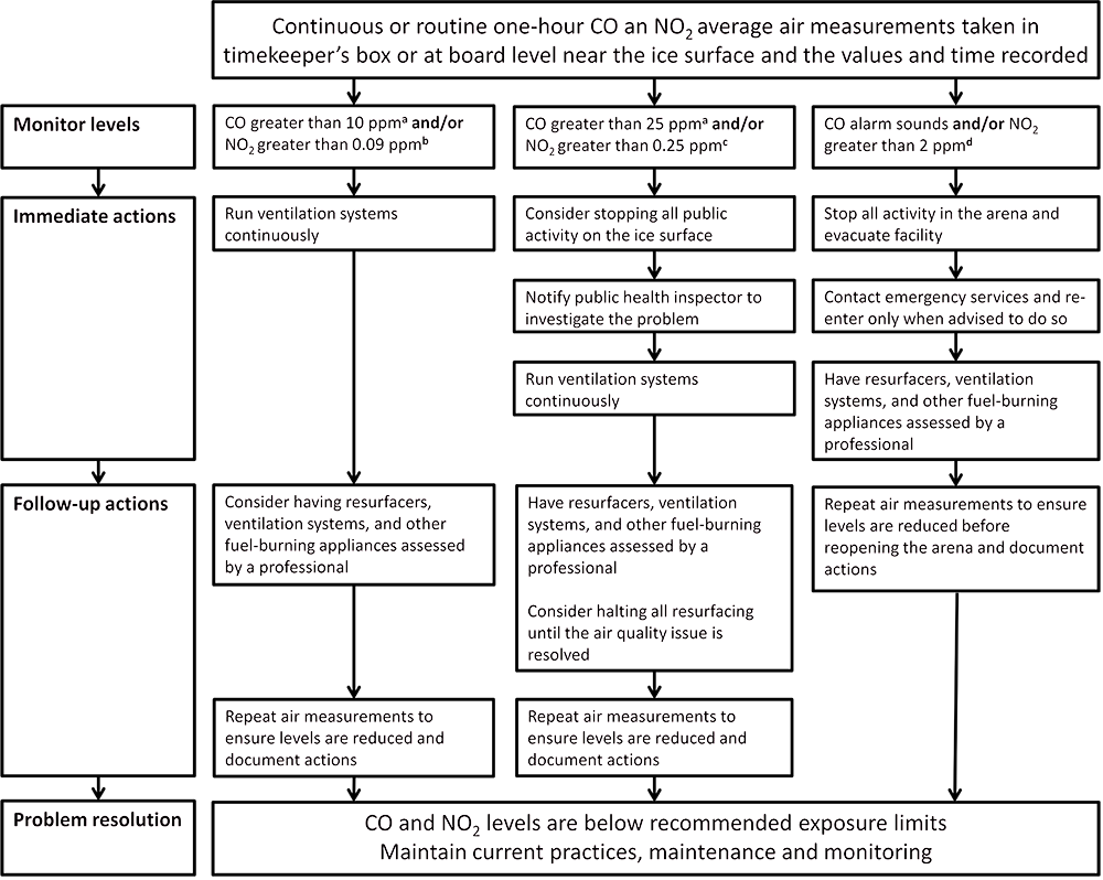 | Follow-up actions | Consider having resurfacers, ventilation systems, and other fuel-burning appliances assessed by a professional Repeat air measurements to ensure levels are reduced and document actions | Have resurfacers, ventilation systems, and other fuel-burning appliances assessed by a professional Consider halting all resurfacing until the air quality issue is resolved | Repeat air measurements to ensure levels are reduced before reopening the arena and document actions |