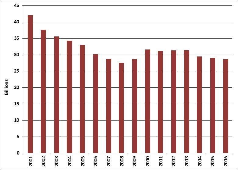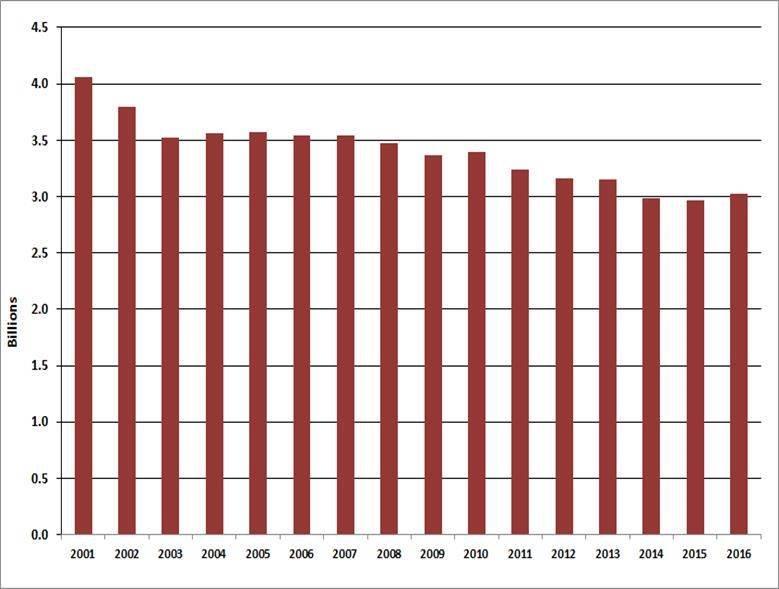 Bar graph showing cigarette sales in Alberta from 2001 to 2021. Cigarette unit sales declined from 4.7 billion in 2001 to 2.4 billion in 2021.