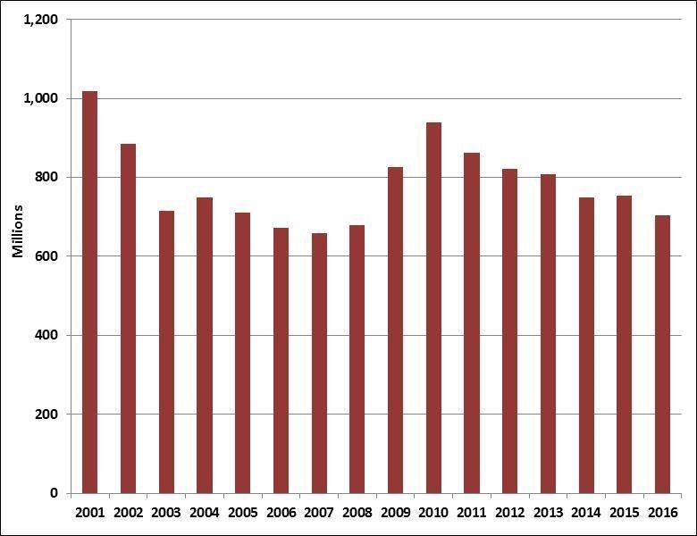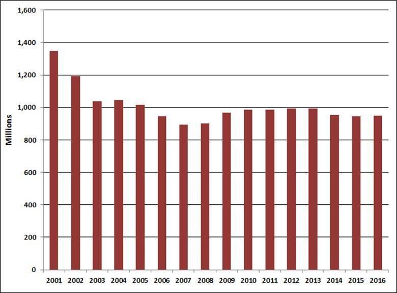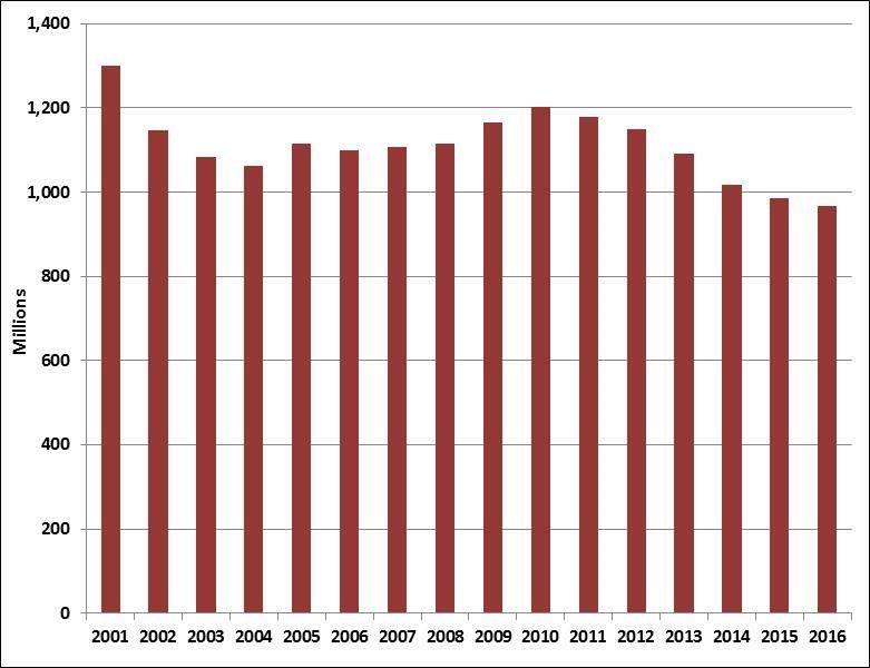 Bar graph showing cigarette sales in Saskatchewan from 2001 to 2021. Cigarette unit sales declined from 1.2 billion in 2001 to 783 million in 2021.