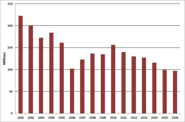 Bar graph showing cigarette sales in Ontario from 2001 to 2021. Cigarette unit sales declined from 17.6 billion in 2001 to 7.4 billion in 2021.