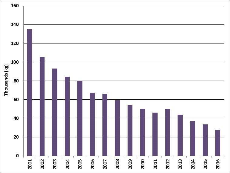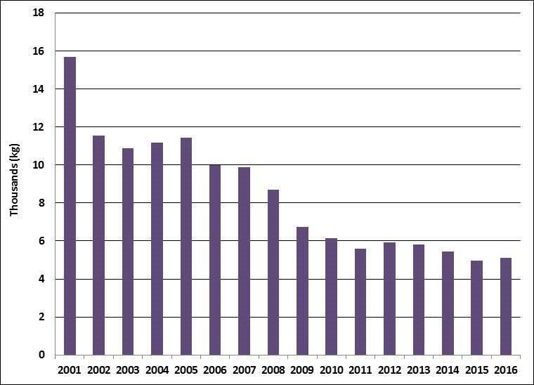 Bar graph showing pipe tobacco sales in Alberta from 2001 to 2021. Cigar unit sales decreased from 16 thousand kilograms in 2001 to 3.3 thousand kilograms in 2021.